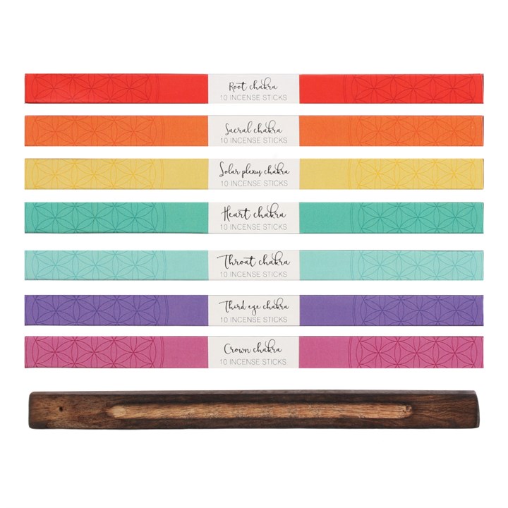 This Chakra Incense Balancing Kit contains 7 individual packs of 10 incense sticks. Each pack represents one of the seven chakras and a different fragrance; Root – Strawberry, Sacral – Orange, Solar Plexus – Lemon, Heart – Mint, Throat – Blueberry, Third Eye – Lavender, Crown – Blackberry. Wooden Incense holder included. Product Dimensions: H22cm x W27cm x D2cm Packaged Dimensions: H22cm x W27cm x D2cm