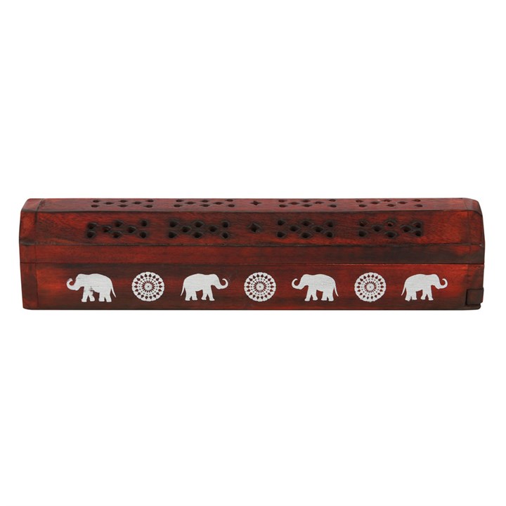This incense gift set includes 10 rosewood fragranced incense sticks in a mango wood box. Printed with white elephant silhouettes and mandala designs, this box doubles as both an incense holder and storage.