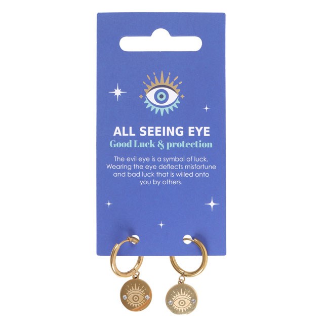 Present loved ones with these stunning gold-toned All Seeing Eye earrings to offer them protection and good luck wherever they go. Also known as the Evil Eye this talisman is a symbol of luck and is believed to deflect misfortune. Made from stainless steel the earrings are presented on a blue card printed with the meaning of this distinctive charm.