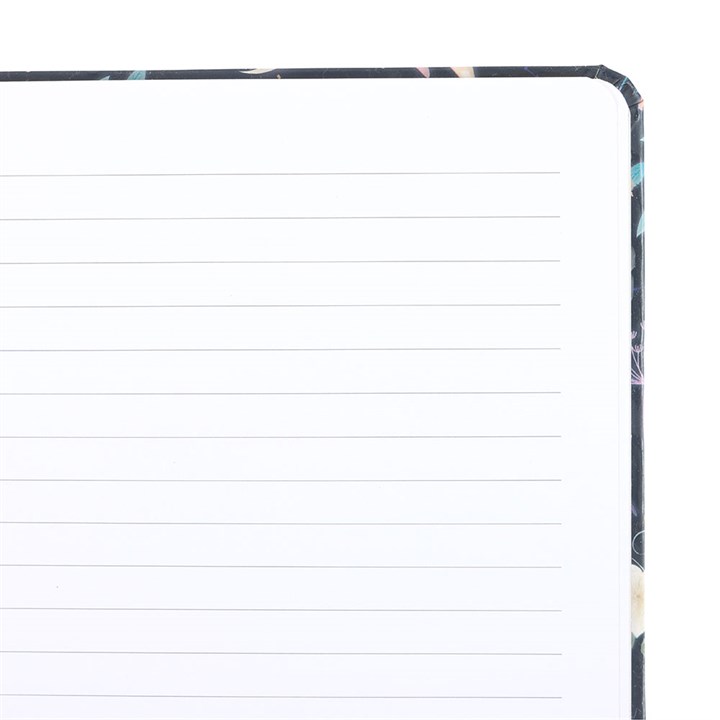 Whether used for notes, lists, or journaling, this beautiful A5 notebook will elevate your desktop with a mystical design of a flying night owl surrounded by midnight moths, crescent moons and forest plants. This notebook is accented by gold foil pages and a blue elasticated closure. Includes 100 sheets / 200 lined pages.