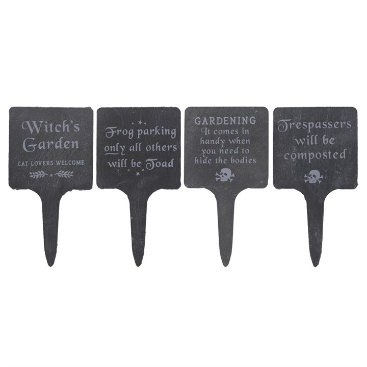 Accessorise your garden with this set of 4 slate signs with a dark, humourous twist. Add to plant pots or borders for quick and easy decoration. Product Dimensions: H19cm x W10cm x D4cm Packaged Dimensions: H13cm x W22.5cm x D5cm