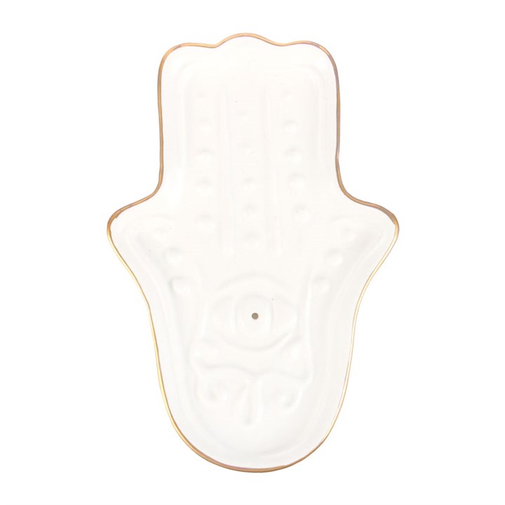 Awaken your senses with this ceramic incense holder shaped like a traditional hamsa hand, also known as the hand of Fatima. Finished in calming white, this ceramic holder will look elegant on a side table or nightstand while catching falling ash.