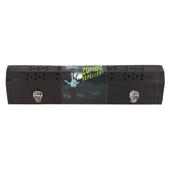 Ward off the undead with this Zombie Repellent incense box set. Includes 10 jasmine-scented incense sticks, providing a sweet floral scent for keeping mutants at bay. Accented with silver skulls, the wooden box doubles as both an incense holder and storage. A perfect set for adding a touch of excitement to your favourite dark hideaway.